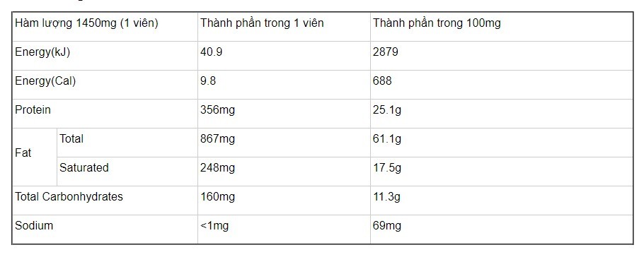 - Các thành phần khác: dầu đậu nành, sáp ong trắng, dầu dừa, lecithin, vitamin E, canxi cacbonat, carbonate, glycerin, nước tinh khiết, bột canxi, gelatin, silica dioxide