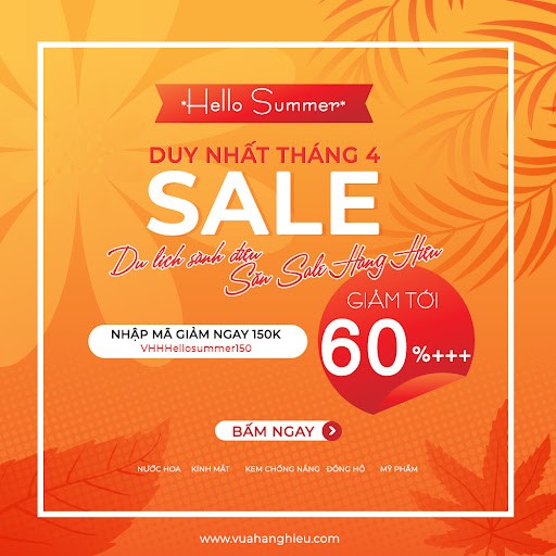 Du lịch thì mùa nào cũng đi nhưng du lịch vào mùa hè thì luôn phải có những đặc trưng như: mũ nón, kem chống nắng, kính râm,.... Ghé ngay Vua Hàng Hiệu tham gia đại hội sale “Săn Sale Hàng Hiệu - Du Lịch Sành Điệu ” và “Xả Hàng Hiệu”.