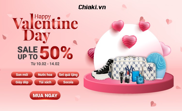 Trong dịp lễ Valentine 2023, Chiaki.vn triển khai chương trình khuyến mại cực kỳ lớn với hàng nghìn ưu đãi hấp dẫn, SALE UP To 50% với một số mặt hàng như: son môi, nước hoa, giày dép, túi xách, socola,..Vì thế, các bạn đừng bỏ qua nhé.