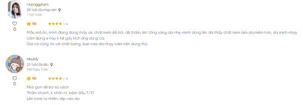 “màu mềnh chọn là màu đỏ dành cho da nhạy cảm, đúng vậy sản phẩm dùng rất thích mịn, nhanh thấm lớp kem không qua lỏng hay quá đặc, không gây cảm giác bớt dính khó chịu, bên cạnh đó sản phẩm giữ tông rất ok mềnh đi ngoài đường cả 1 ngày về vẫn ok có hiện tượng vó cục kem lại 1 chỗ.” – Bạn Nguyệt Nga.