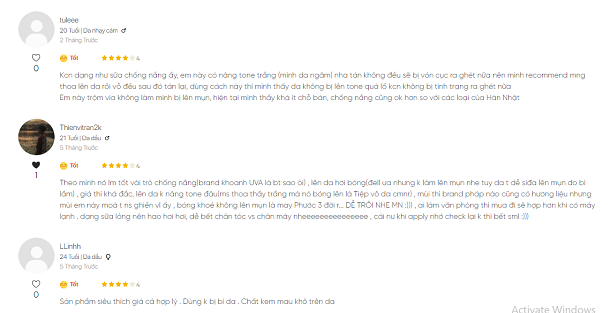 “Tác dụng chống nắng tốt, dưỡng ẩm tốt, thành phần an toàn, không gây nhờn rít trên da, chống thấm nước hiệu quả, chất kem mịn, loại không có kem nền có kết cấu lỏng hơn loại có kem nền, loại có kem nền - apply lên da rất đẹp. Dễ rửa trôi khi rửa mặt. Đã dùng 2 tube loại có kem nền và 1 tube không có kem nền, giá chênh lệch khoảng 100.000đ, sẽ tiếp tục mua dùng lâu dài.” - Bạn Ly.