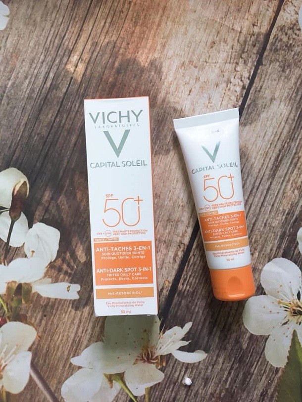 Kem chống nắng Vichy Anti Dark Spots được hòa trộn với các phân tử màu khoáng tạo ra một màu đặc biệt có khả năng che đi những khuyết điểm trên da một cách tự nhiên. Chất kem mịn, khá đặc, khi thoa kem lên các màu sẽ tự động tiệp với nhau, giống màu của da, làm đều màu hơn.