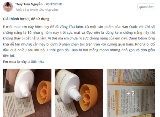 “Nói chung em này cũng không phải quá xuất sắc. Ưu điểm là kem thấm thanh, mát, không bết dính, khả năng chống nắng ở mức ổn. Tuy nhiên kem dễ trôi khi gặp mồ hôi và nước, mình khuyên là không nên thoa da mặt. Với lại mùi theo mình cũng thơm mà hơi lạ lạ nên nhiều bạn không thích.” – Bạn Thanh Trúc.